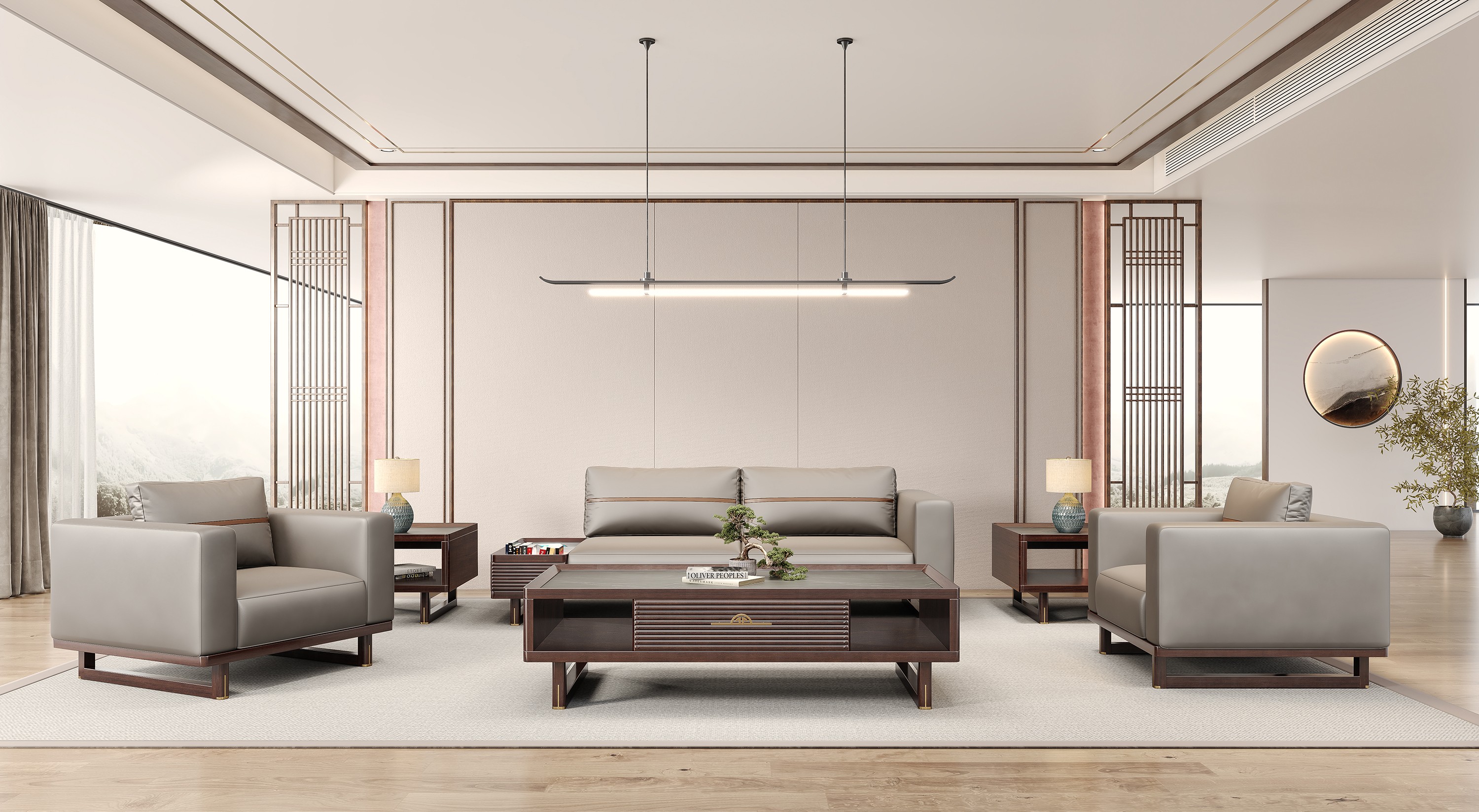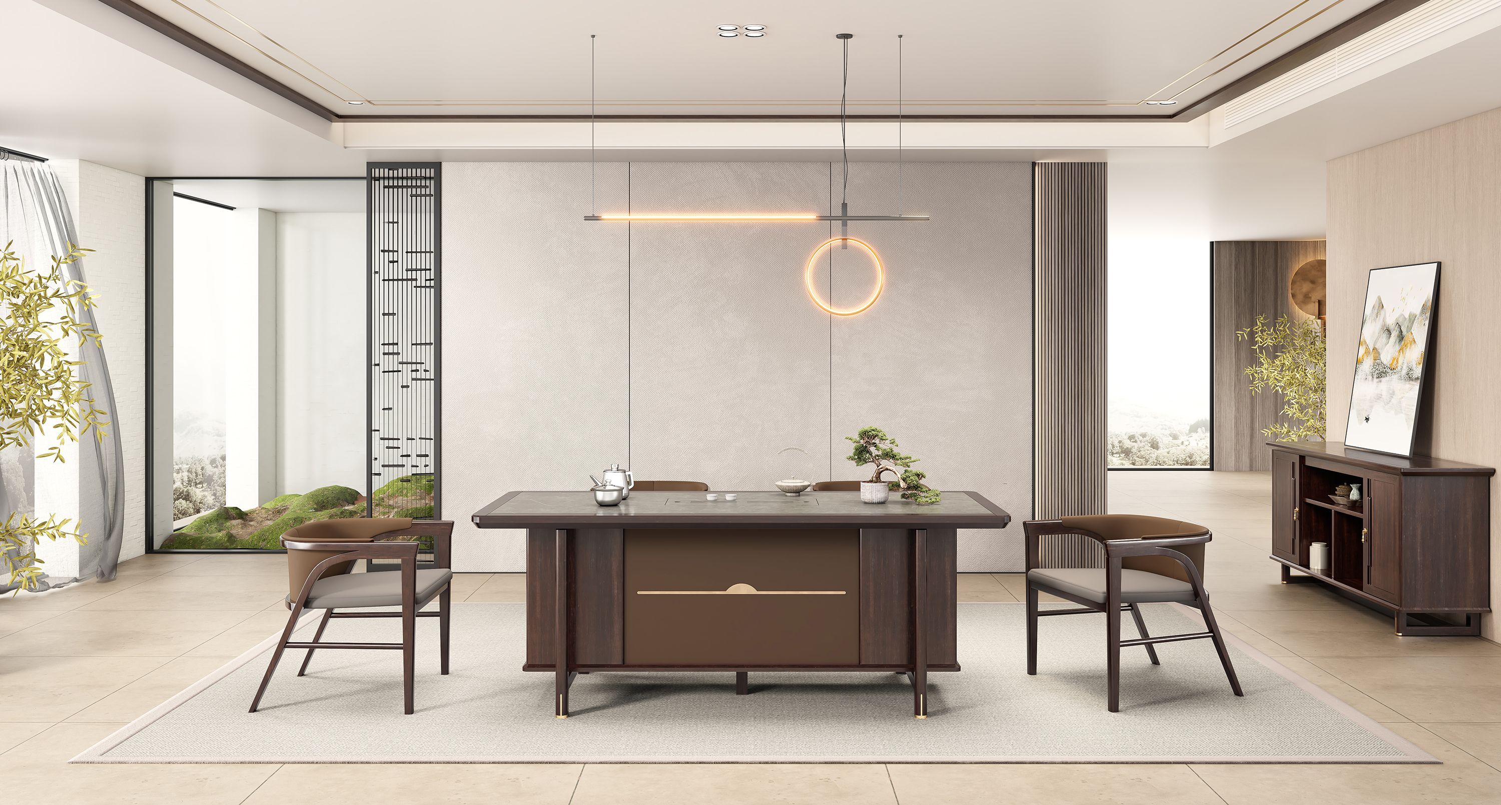 鸿泰系列是一款新中式风格的总裁办公产品,设计灵感源于中式传统装饰纹样“回”字形,因其形式回环反复,延绵不断,有吉利长久的吉祥寓意在造型上主要采用硬朗简洁的直线条,温洞的乌金木与质朴的岩板相结合刚柔并济,时尚大方,既有中式家具古典质朴的内涵显现